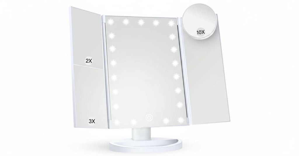 LED Lighted Vanity Mirror, 2–10× Magnification, Trifold & Portable